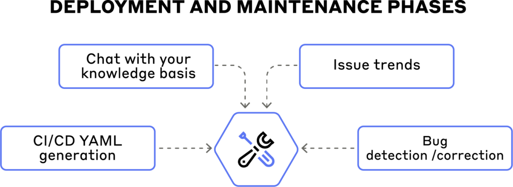 In the deployment and maintenance phases, AI generates CI/CD YAML, supports bug detection and correction, and powers conversational interfaces through AI Agent Factory, allowing end users to query support documentation and application knowledge bases in natural language. These tools not only reduce the support burden but also significantly improve the user experience.